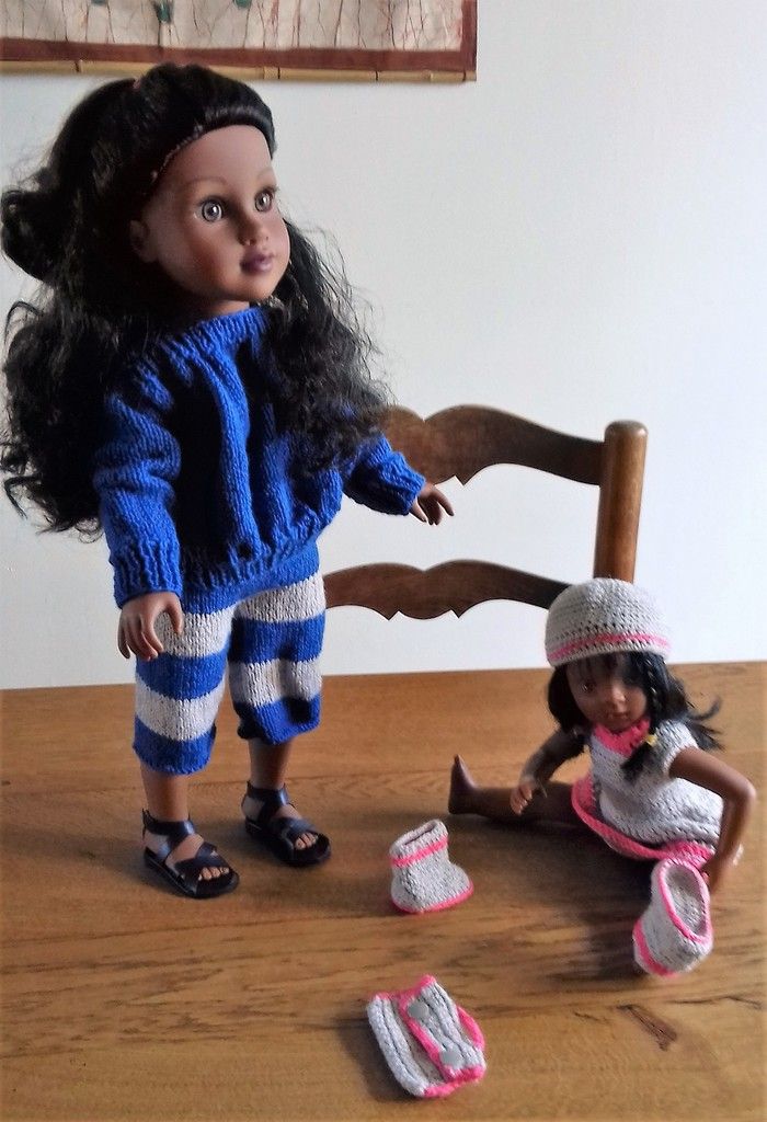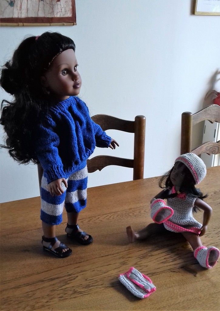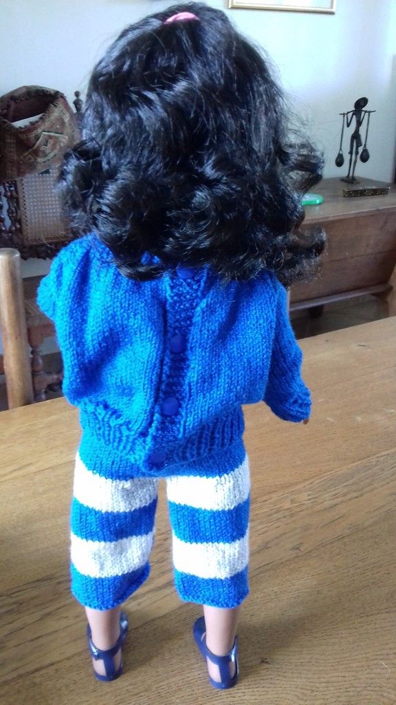 Chavonne porte un bermuda tricoté au hasard et un gilet inversé, modèle offert par Nathalie (Les créas de Nathalie).