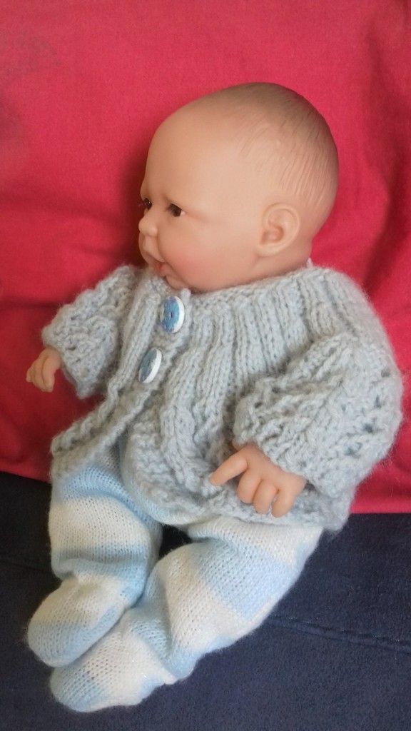 C'est à ce petit poupon de 25 cm que je destinait la combinaison jaune à noppes montrée précédemment. Hélas, elle était trop grande. En attendant de lui en tricoter une à sa taille, je lui ai fait un gilet pour compléter sa tenue d'origine. Le modèle est de Catherine Chambiron,