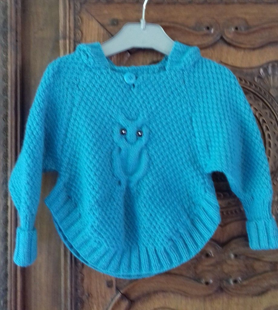 Sur le même modèle que celui tricoté pour Maïa, dans une laine plus classique, avec un hibou en relief.